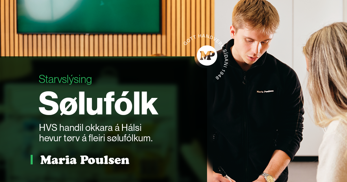 Afturfyri bjóða vit eitt starv við nógvum dugnaligum starvsfelagum, sum eru før fyri at hjálpa tær fakliga tá ið á stendur. Starvið fer uttan iva at avbjóða teg, og hevur tú hugin og áræði, so eru nógvir møguleikar hjá Mariu Poulsen til at fáa nýggjar og enn størri avbjóðingar sum frá líður.