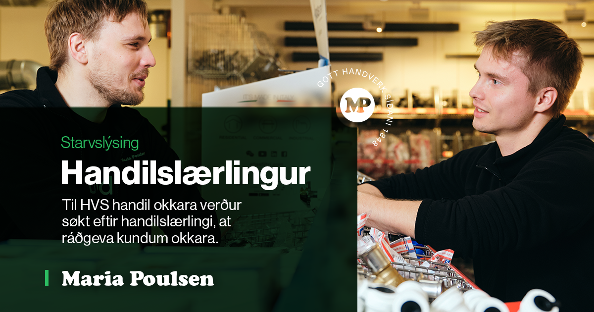 Maria Poulsen er meir enn 175 ár og er millum elstu fyritøkur í landinum. Vit eru tann størsti HVS heildar veitaran í Føroyum. Vit bjóða heildarloysnir innan hitaskipanir, vatn, ventilatión, kloakk, og baðirrúmmøblar. Tað starvast um 40 starvsfólk hjá Mariu Poulsen, 14 av hesum eru í handli okkara á hálsi.